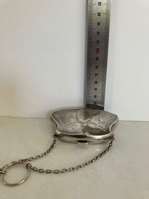 This stunning sterling silver purse with finger chain features an elegant swag design incorporating a central flower and foliage and its original fitted leather interior. It was made by E J Trevitt & Sons in 1918/19 and assayed in Chester. It isn't monogrammed so it could be personalised if you wish. There are some very minor knocks to the back of the purse and a split in the leather near one of the seams as shown in the photos but it is in very good condition overall. It is rare to find these with the leather interior in such good condition now.
