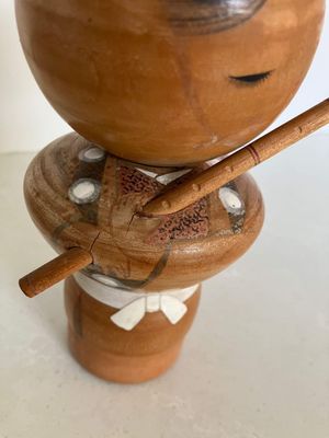 This flautist is by Sekiguchi Sansaku and it came to me with the kokeshi with the hair ornament listed separately by Izumi Ueda. I believe the two have spent their lives together as companions. The flautist is showing its age with significant fading but it is otherwise in very good condition. These vintage kokeshi are highly prized by collectors and bring a lovely warmth to a space.