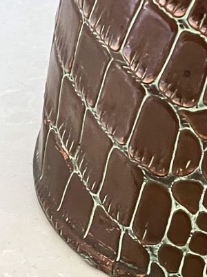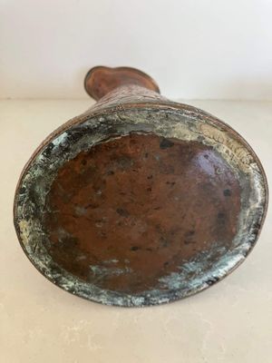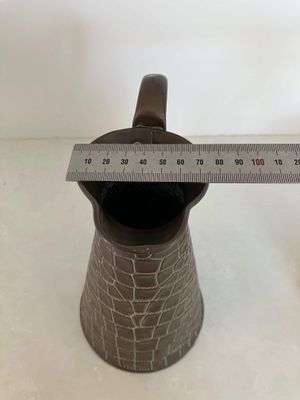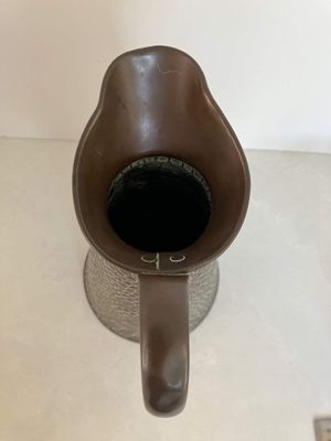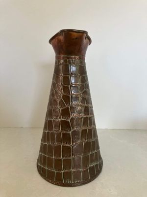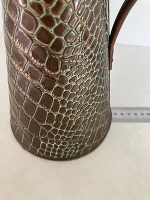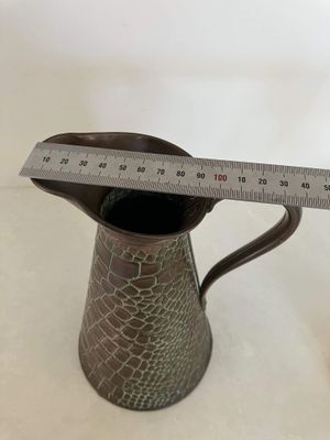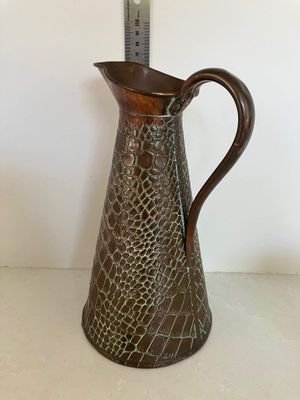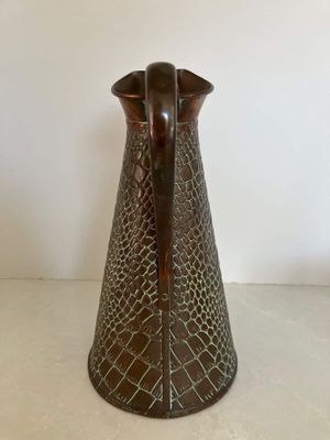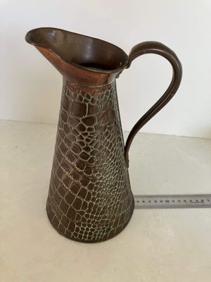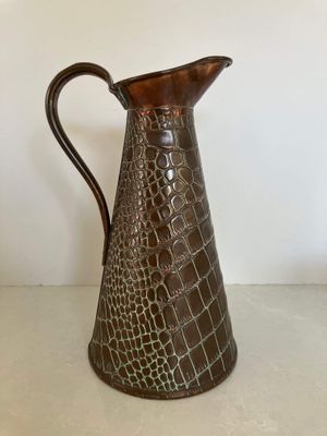 This antique copper hot water jug was produced by Joseph Sankey and Sons of Bilston, England. The firm was established in the late nineteenth century and appears to have ceased production in 1932. This lizard skin style copper jug is in very good order - it has a minor dent on one side that isn’t particularly noticeable because of the complex pattern and at some point the base appears to have been soldered. This isn’t visible when on display and means (that unlike some I’ve had) this jug remains watertight. It is full of antique charm and would look fantastic filled with flowers or in a group of copper or Arts and Crafts era pieces.