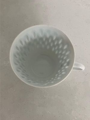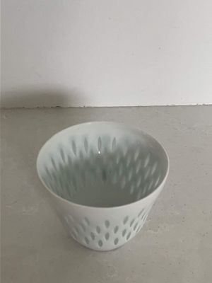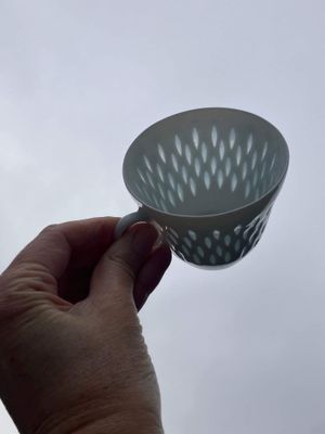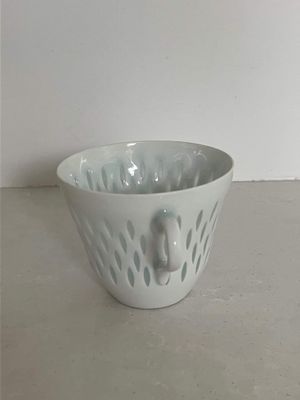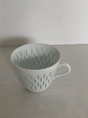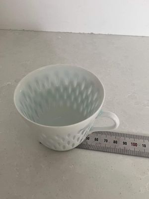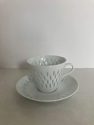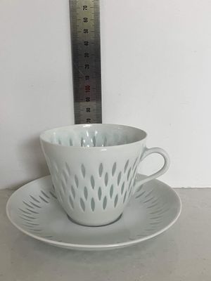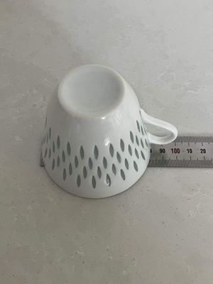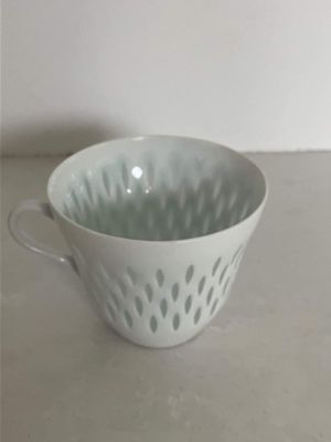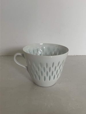 This mid-century (c.1950s) cup and saucer by Arabia of Finland is so elegant. These rice pattern or riisiposliini pieces were designed by Finnish designer Friedl Kjellberg-Holzer. The rice grain-like windows are so very fine it seems impossible that they would contain liquid, but remarkably they do. This pair is fully marked and in excellent condition. This piece epitomises stylish vintage design that still seems contemporary. Drinking from this outstanding vessel would be the perfect start to any day. It is in excellent, as new, condition.