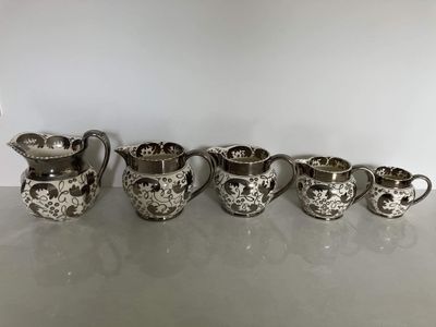 This set of five Wedgwood graduating jugs was made in the mid-twentieth century and features a silver lustre glaze. They look great together and are in very good order. Wedgwood is one of the most recognisable names in British ceramics. For over 260 years the company has set trends, producing fashionable, desirable ceramics for a broad range of consumers.