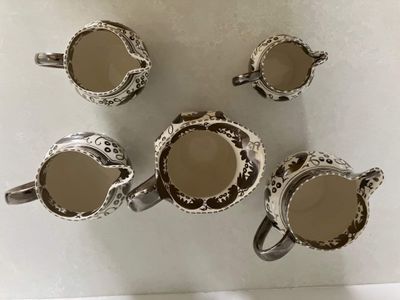 There are some small rubbed areas on the glaze on two of the jugs but they have no chips, cracks, crazing or repairs. The tallest is 140mm high and the smallest is 70mm high. The photographs show all the other measurements.