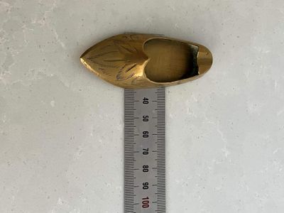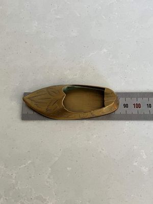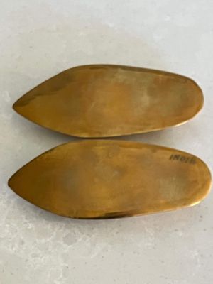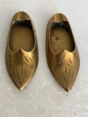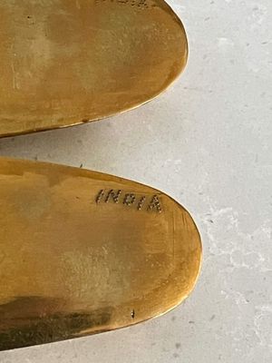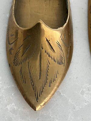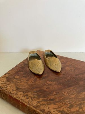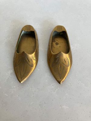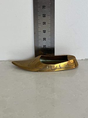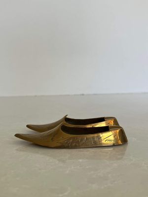 This pair of small brass shoe-shaped ashtrays was produced in India and would have been made c. 1960-80. They are well made and a nice display item for shoe or brass fans. They are in good vintage condition. Additional props in photographs are not part of the sale.