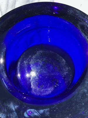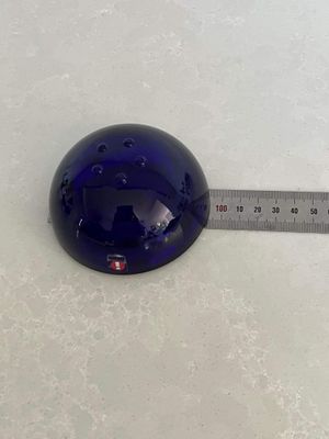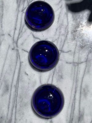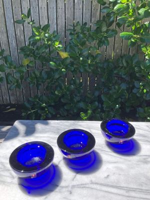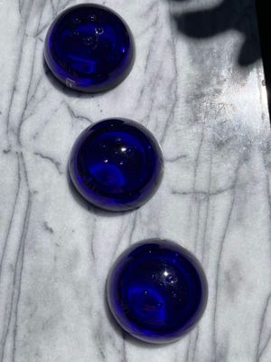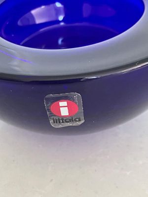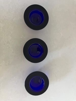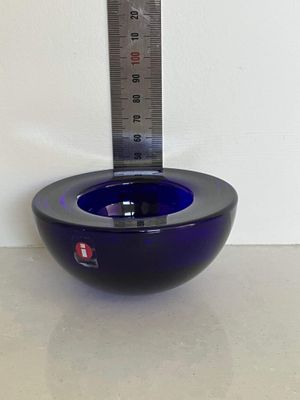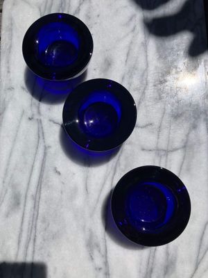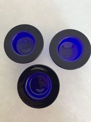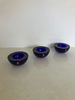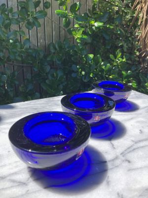 This set of three Ballo candleholders in cobalt blue was made by Iittala in Finland. The half sphere shaped votives reflect the light, creating a warm atmosphere for your table. They were designed for Iittala by Annaleena Hakatie and were manufactured between 1997 and 2005. They still have their original Iittala stickers attached. They are substantial with each weighing over 400 grams. They are in very good condition, though one of the three has some minor surface damage internally that is only noticeable in bright light and would not be visible if a candle were present.
