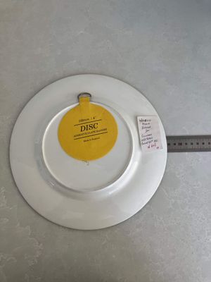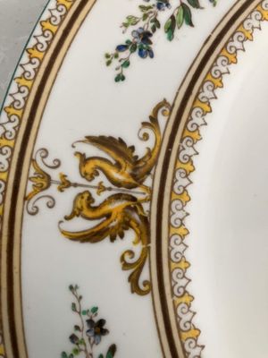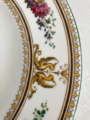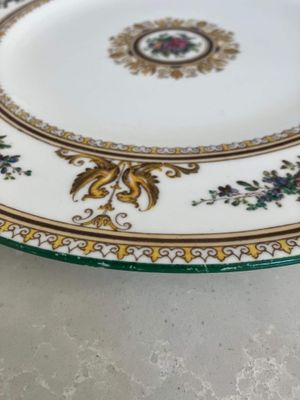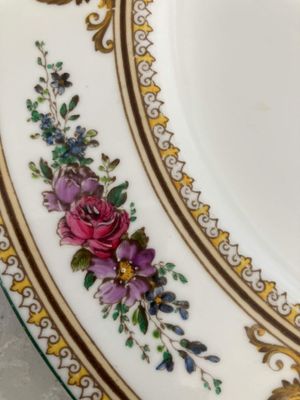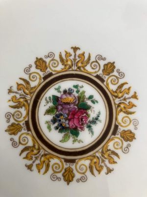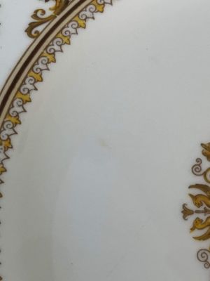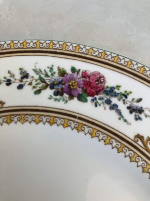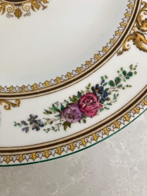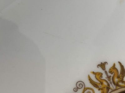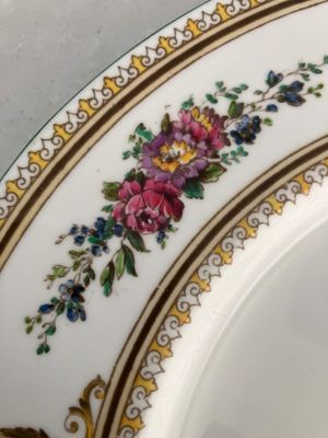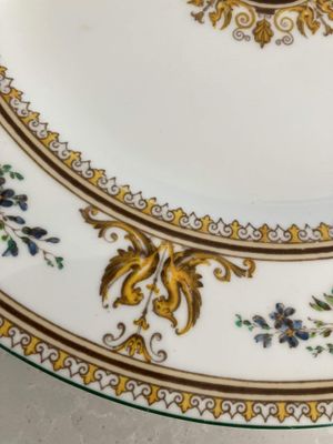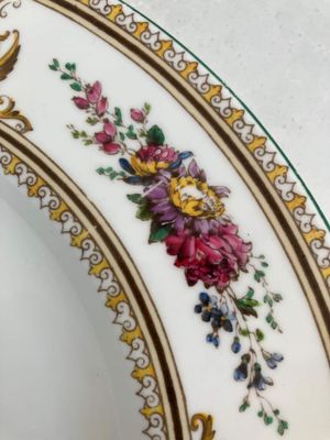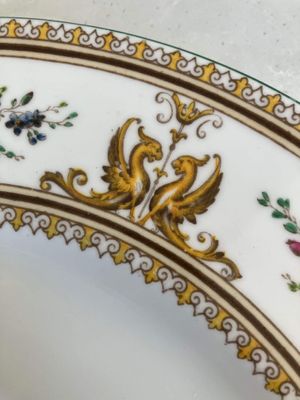 This elegant Wedgwood plate in the Columbia pattern features a fabulous design alternating floral vignettes and pairs of griffins with a central medallion. While there is a hanger on the back that obscures the usual details, the previous owner kindly recorded them and attached them on the back with a sticker. The D4 on the back indicates this plate was made in 1934. The design was produced for 73 years from 1924-1997. It is beautiful, elegant and in very good condition. There are a few minor surface scrapes and a very small area of minor discolouration (see photos) but they do not detract from the beauty of this plate that would be lovely hung alone or on a gallery wall (whether all plates or art and plates combined).