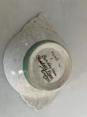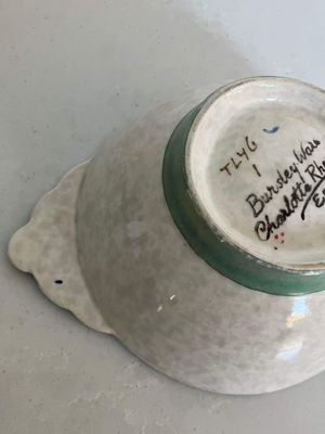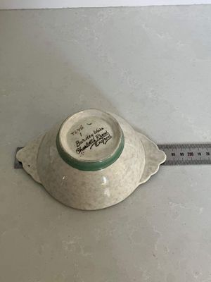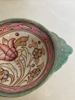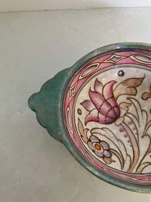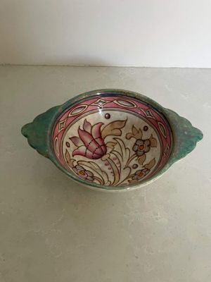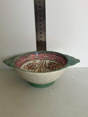 Charlotte Rhead (1885 - 1947) was one of the great British art deco ceramic designers. She was renowned for her use of the tube-lining technique and the raised outlines you can feel in the surface of the work served as guides in colouring the pieces. This Bursley Ware piece is in excellent condition with no chips, cracks, with only very minor age appropriate wear to the glaze around the rim. It is a really unusual shape - quaich-like in form and hard to find.