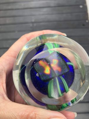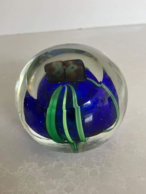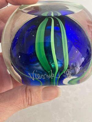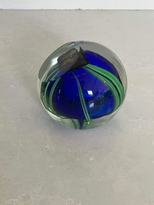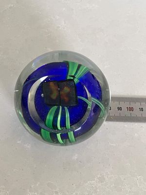 This beautiful Peter Viesnik paperweight was made in 1998 and includes dichroic panels that change colour when viewed from different angles. I love the deep blue and green at the heart of this piece. There is a tiny surface scratch but it is otherwise in perfect condition. Peter Viesnik is one of New Zealand’s best known hot glass artists. He built a workshop in Albany just outside Auckland in 1979. Now in his eighties, he has ceased glass blowing. This stunning paperweight would make a fantastic addition to an art glass or paperweight collection.