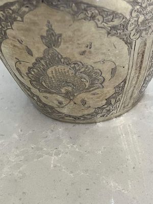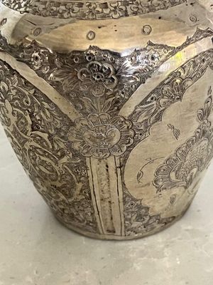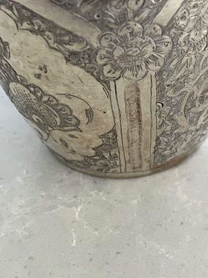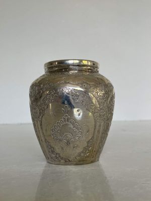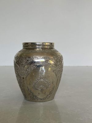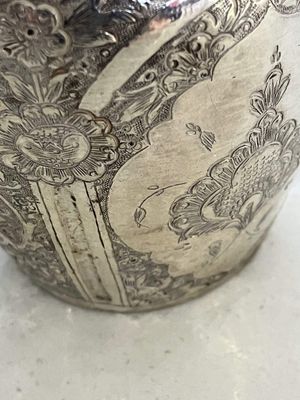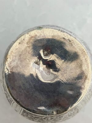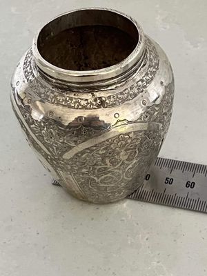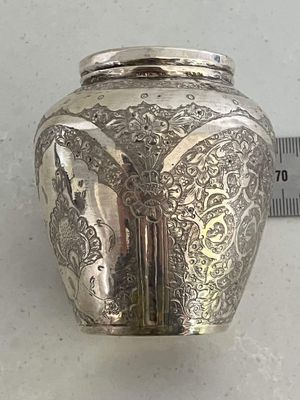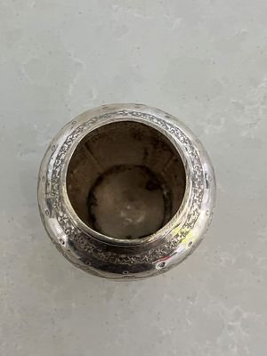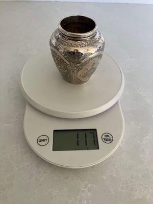The marks are a little worn but this Persian silver vase is stunning. The XRF testing came back at 79.8% so it’s essentially 800 silver. It features an incredibly intricate hand chased design. It’s only 7.5 cm tall and 6.5 cm wide but weighs a hefty 117 grams. This beautiful vase is all silver and not weighted like the majority of silver vases. Perfect for some small blooms or on display.