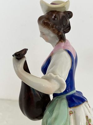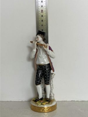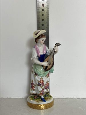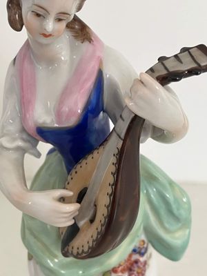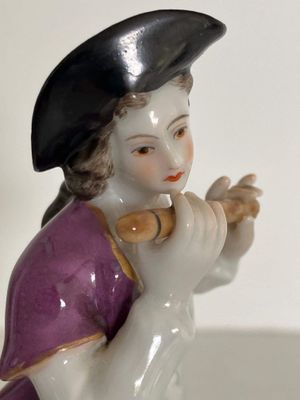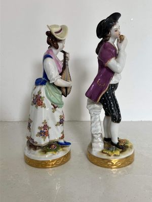 A pair of German porcelain figures produced by the Aelteste (Oldest) Volkstedt Porcelain Factory, Thuringia, circa 1900. Both figures are modelled in the Dresden style, each on a circular base with a relief gilt border and painted in rich polychrome enamels. The female musician playing the lute is in perfect condition, but the male figures has at some point in his life lost the end of his flute. It isn't a particularly noticeable flaw. The quality of the modeling and painting is excellent.