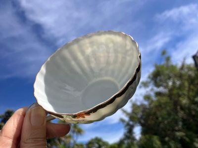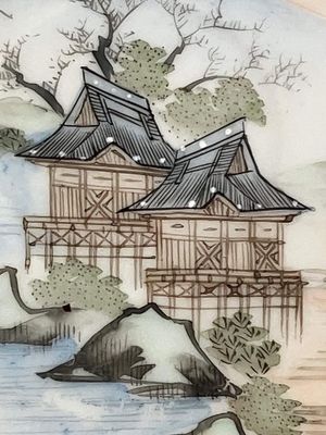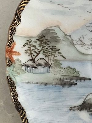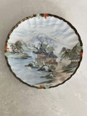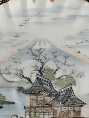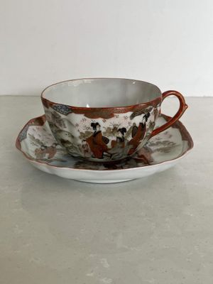This beautiful hand-painted Kutani eggshell porcelain cup and saucer is in excellent condition. It is difficult to date Kutani ware (Kutani-yaki) precisely but the use of fine eggshell porcelain and the high quality of the painting on this duo indicate it was produced at the beginning of the twentieth century. This antique pair are both signed to the base. It was almost certainly produced for export - after the re-opening of Japan to the West, there was a fascination with Japanese culture that resulted in the widespread Japonisme in Europe, with many artists and designers being influenced by these pieces as they became available. The buildings are particularly well painted looking toward the iconic symbol of Japan, Mt Fuij. They would be an excellent addition to a collection and could certainly be used but will need to be handwashed.