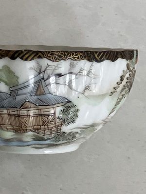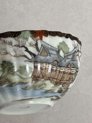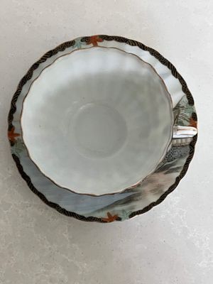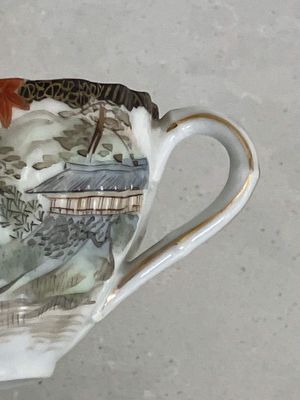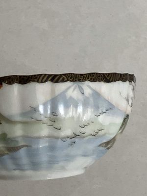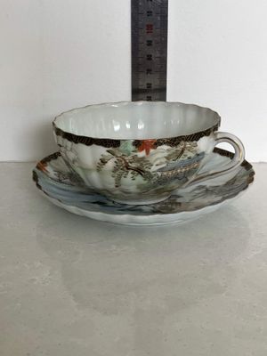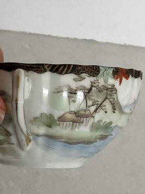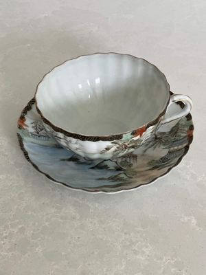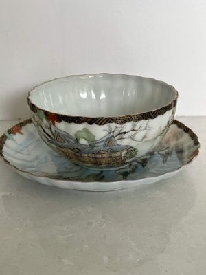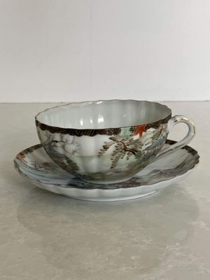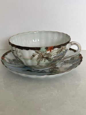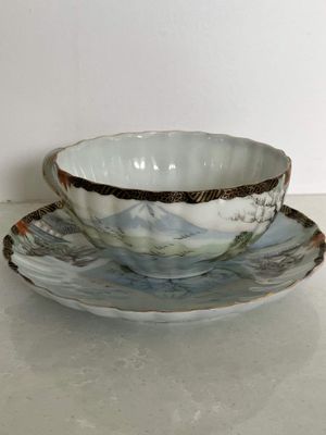 Handpainted Kutani eggshell porcelain cup and saucer - rural scene with Mt Fuji