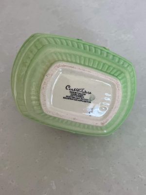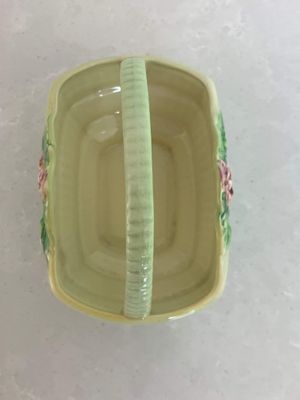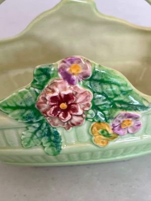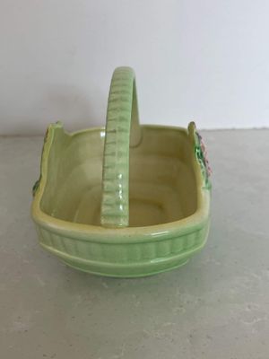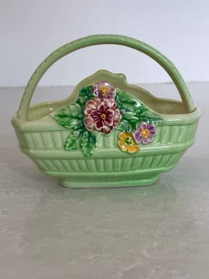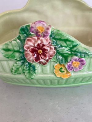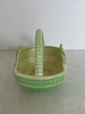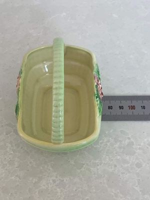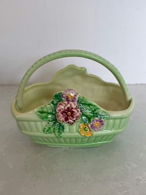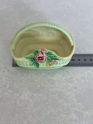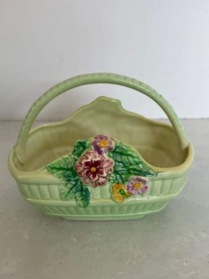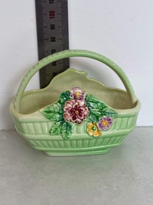 This charming Carlton Ware posy basket features a soft green glaze and is finished with delicate hand-painted floral details on either side. Due to its petite size, this piece is best suited to decorative use rather than holding flowers. This small piece is perfect for styling on a shelf, dresser or windowsill, where it will add a gentle touch of colour and character to a cottage-style interior. Full of charm without being overstated, it’s the kind of vintage piece that feels quietly special. It is in great condition. There is the usual crazing expected on a vintage piece of Carlton Ware and there is a small darker area internally but consistent with age and careful use. This is one of their Australian designed pieces.