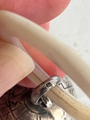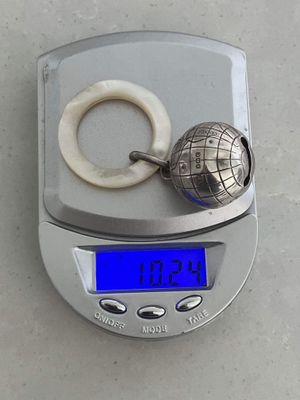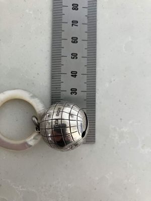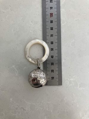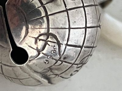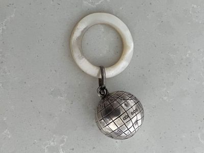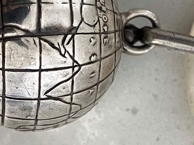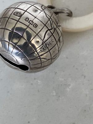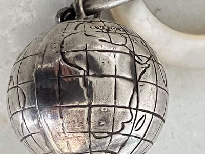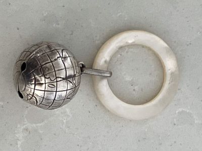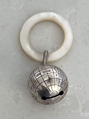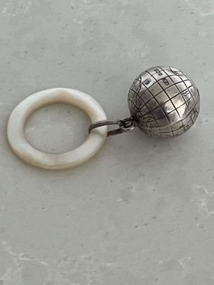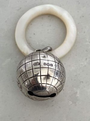 We all want to give our children the world in one way or another - back in 1902 someone succeeded beautifully with this rattle and teething ring. As is often the case with small representations of the globe, New Zealand doesn’t make the cut but Australia is present. The mother of pearl teething ring is in excellent condition. The globe-form bell has a few minor dents consistent with age. It was assayed in Birmingham and made by jeweller Arthur Johnson Smith. This little treasure would be a lovely gift for a new addition to your family - though perhaps not for teething given it is 124 years old. It is a rare form as I have found nothing similar.