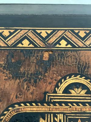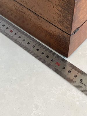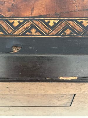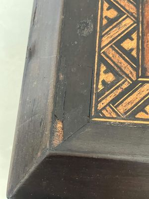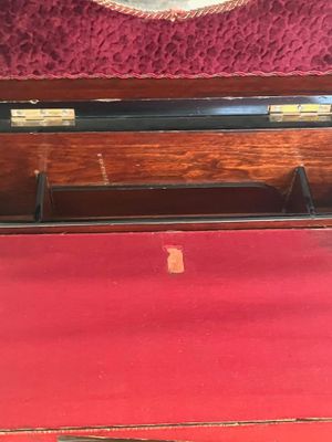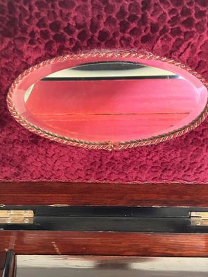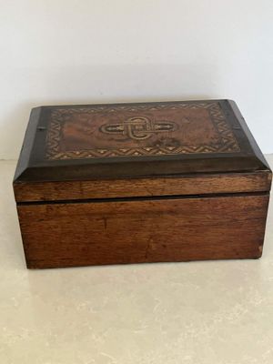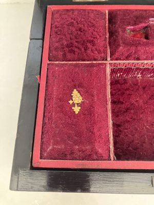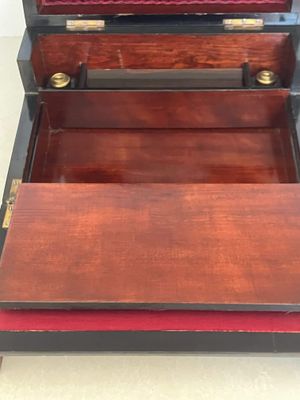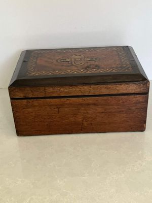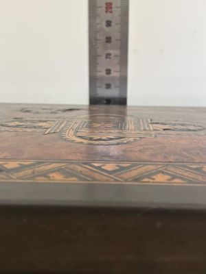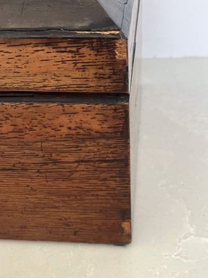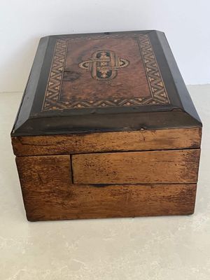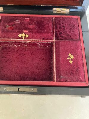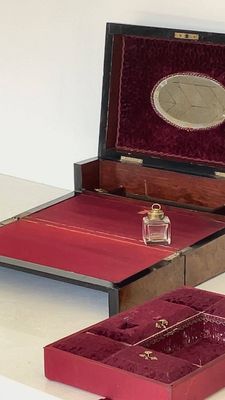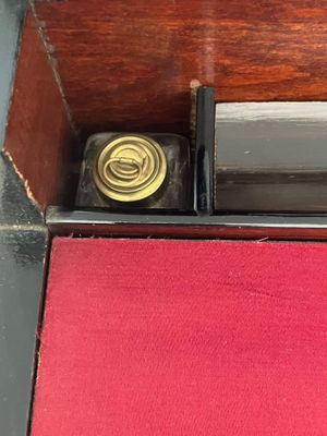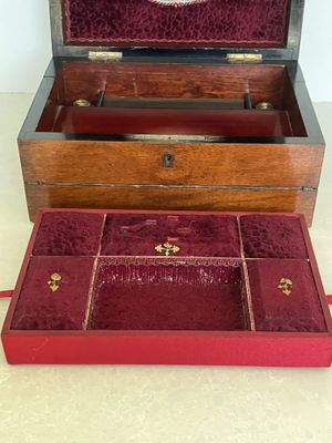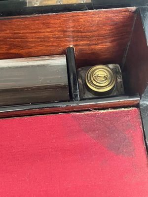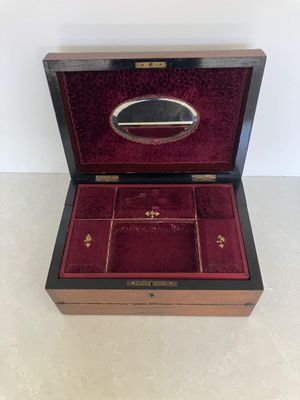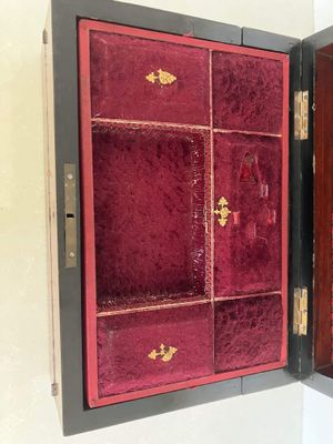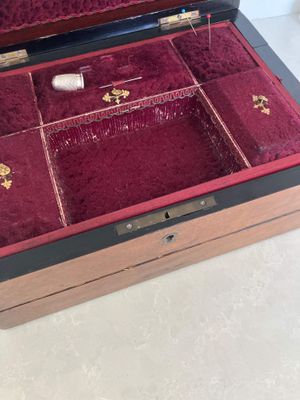 My obsession with antique boxes may have reached its zenith with this piece. I’ve had writing slopes, sewing boxes and jewellery boxes before but this rare Victorian treasure combines all three in the ultimate travel companion. There is a lovely oval mirror with beveled edge in the lid, spaces to store jewellery as well as places for a thimble, needles and in-built pin cushions on the upper level. When the upper level is removed, it folds out into a lovely writing surface complete with its original brass topped inkwells on either side. There are some inlay losses and repairs that are evidence of its long life. Over its approximately 150 years, there has also been some wear to the interior and it has lost the little ribbon or fabric piece that made it easy to lift the writing surface to access the storage below but it would be a very easy repair. This antique inlaid walnut marquetry box is truly a delight. The sterling silver thimble is for display only but we have some thimbles for sale separately. There is a video of this beautiful antique box on our instagram and facebook pages.