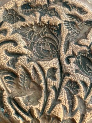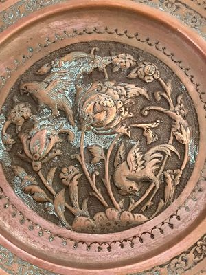 This beautiful copper plate is really a wall hanging as it is impractical to use. I was immediately drawn to the complex central design full of birds and flowers. It is an example of Persian Ghalam-zani (hand-engraved) copper and brass art. To create these repoussé and chased plates, the metal is hammered from the back to create high relief and then finely engraved on the front. This piece is very characteristic of Isfahan, in central Iran, which remains the historical center for this type of traditional handicraft. Isfahan was the capital of the Seljuk and Safavid dynasties (11th and 17th centuries). It is difficult to date traditional pieces like this, but it most likely dates from the early to mid twentieth century (c. 1920-40).