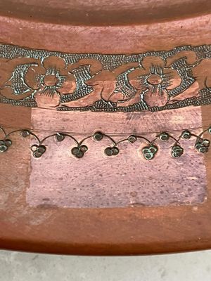 This piece is in lovely condition and has a lot of patina. It could be polished back to bright copper if that is your preference. There is a small area at the bottom of the plate where a sticker was attached for a long time and the difference in colour of the copper shows its lack of exposure to oxidisation. Now it has been removed it will eventually develop the same patina as the surrounding area.