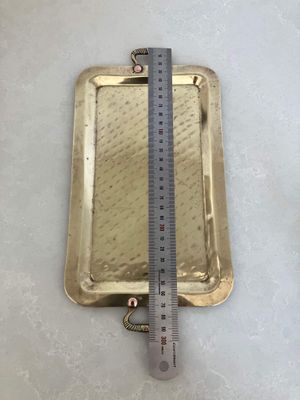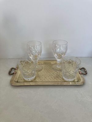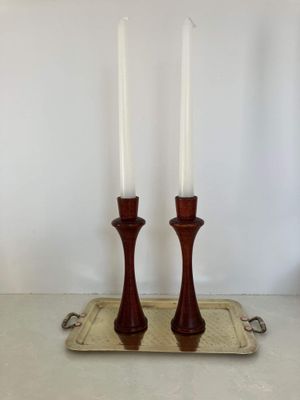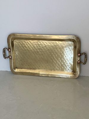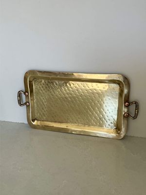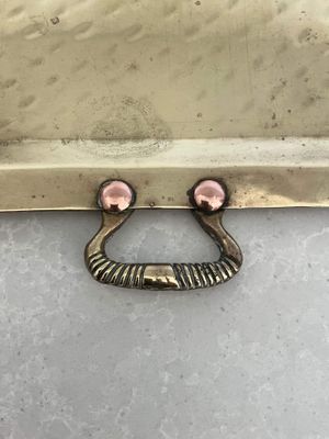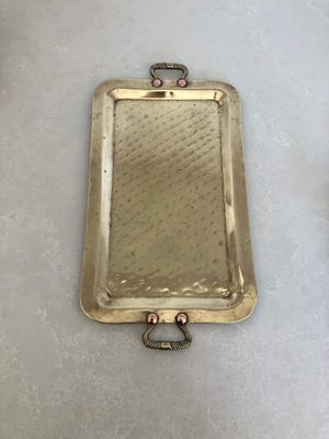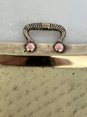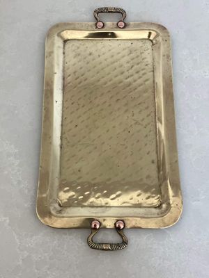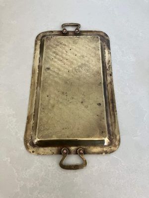 I usually avoid polishing old brass and copper as I love the patina they develop over time but this lovely small tray had very uneven patina as a result of past use, so I decided to return some of its original shine. The upside of this is the revelation of the bright copper rivets securing the handles that were previously much less noticeable. Like a lot of brass from the period, it isn't marked other than numbers on the back of the handles but it dates from around the 1930s. It was previously used to hold candles (as evidenced by the wax that needed to be removed) so I have shown it with a modernist wooden pair as wood and brass look good together and it is a practical way to keep wax from precious surfaces. It would also be fantastic on a desk or as a small bar tray. The candlesticks and crystal glasses are for display purposes only.