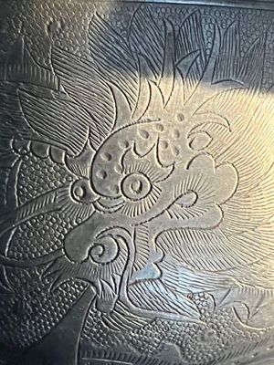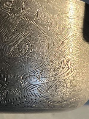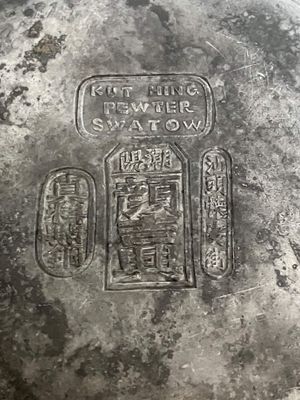 Kut Hing was a prominent Chinese pewter maker based in Swatow (now Shantou) during the late 19th and early 20th centuries. Known for intricate hand-engraved dragon motifs, their high-quality pewterware—including tea sets, canisters, and barware—was often designed for export, featuring both Chinese characters and English signatures. They were active from the late 1800s through until the 1920s and were known for producing high-quality pewter pieces. The dragons (symbolizing power) and intricate floral designs on this piece are typical of their highly regarded work. Kut Hing pewter is an example of Chinese colonial-era metalwork, blending traditional Chinese craftsmanship with the demands of the export market. These pieces are popular for their intricate designs and quality workmanship. There are some minor knocks to this bowl, consistent with age and use.